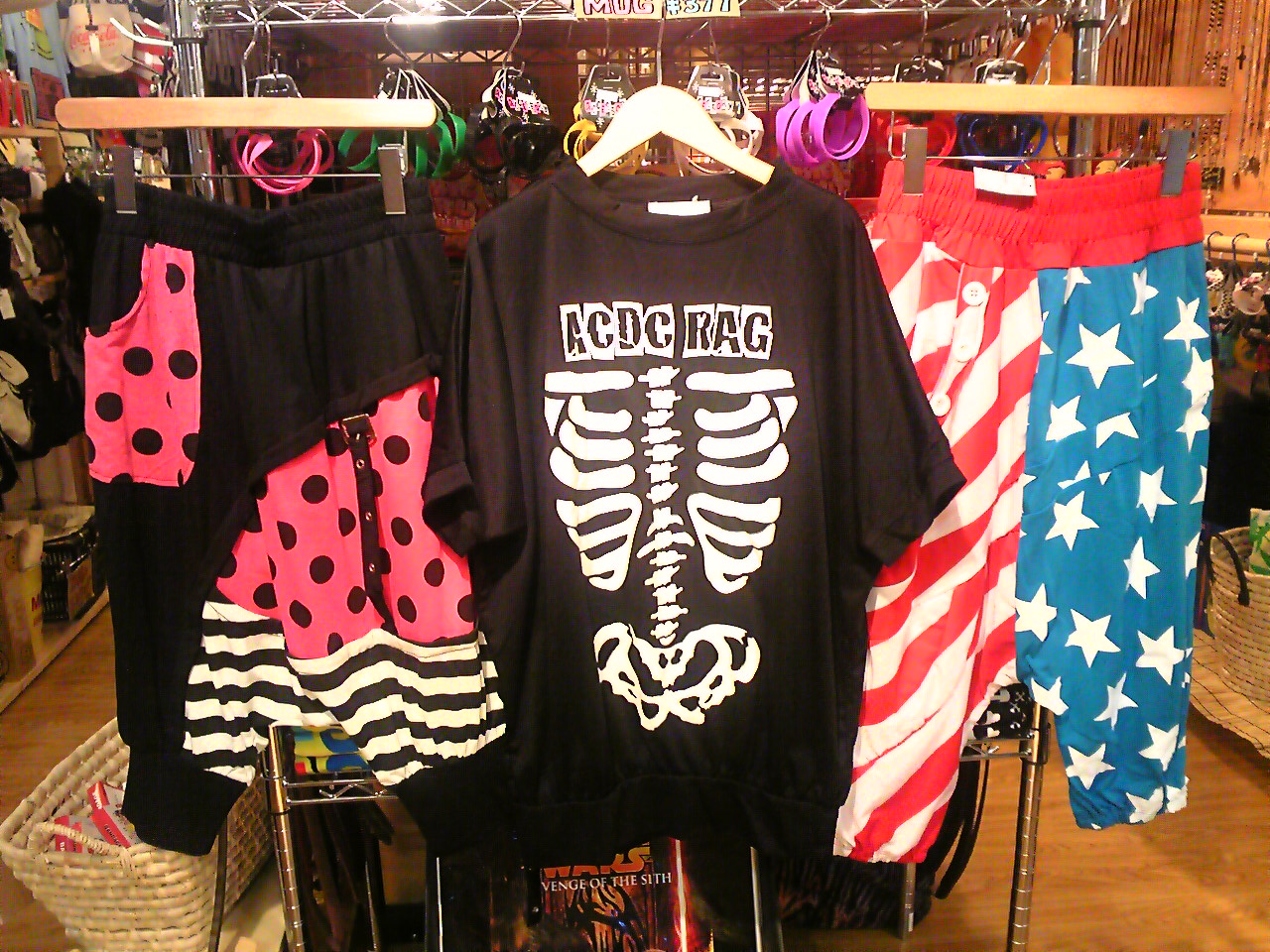 真ん中のスカル・ドルマンカットソーは¥2625、両サイドのサルエルは¥3045とこの作りにしてお手頃価格