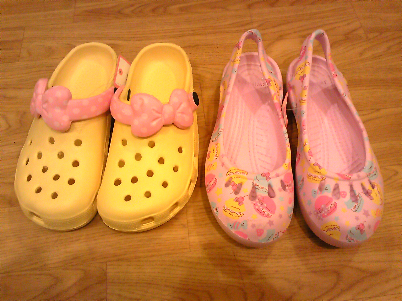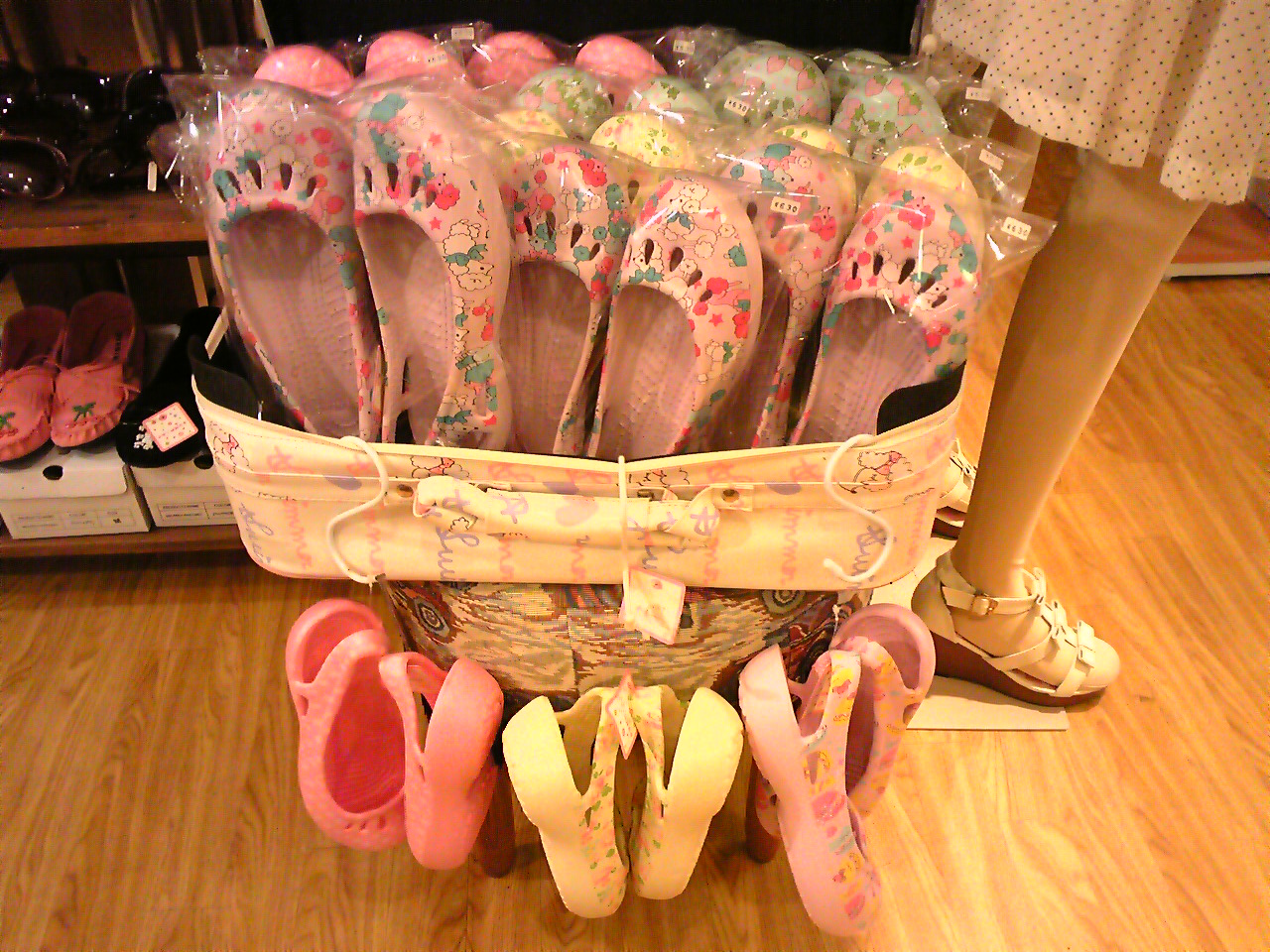 サイズはどちらもS、M、L(23.5~24.5㌢)でカラー&デザインは5タイプ、価格はサボタイプが¥609でパンプスタイプが¥630です
