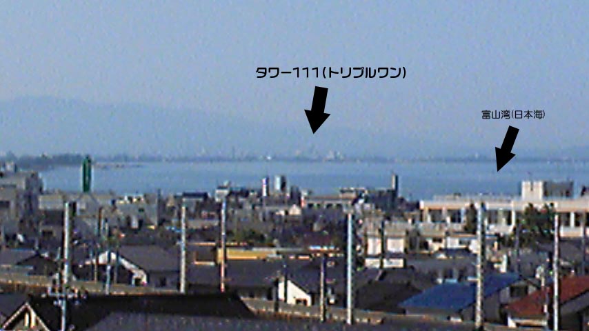 下の写真は今朝魚津店が立地する魚津サンプラザ立体駐車場6Fから撮影したものなのですが海(富山湾)の向こうになんとタワー111が見えるのです(写真ではわかりづらいですが肉眼ではもう少しはっきりと見えます)! 実はこの景色、今に発見したものではなく「いつかはあの場所に絶対出店する!」という強い気持ちを持ちながら以前よりずーーーっと眺めていた景色だったのです