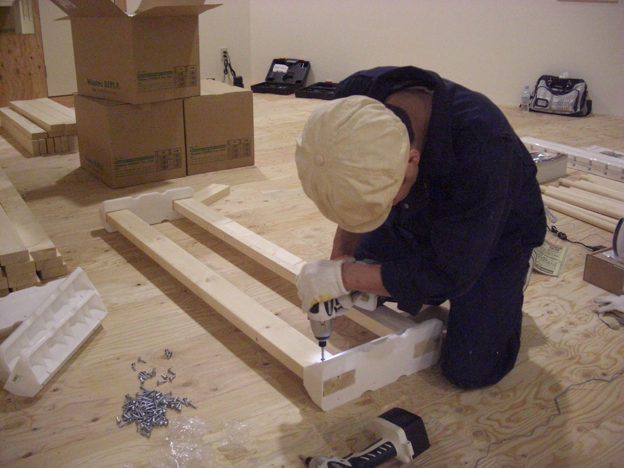 新店オープン準備で作業中のトモさん…今回も手作り什器
