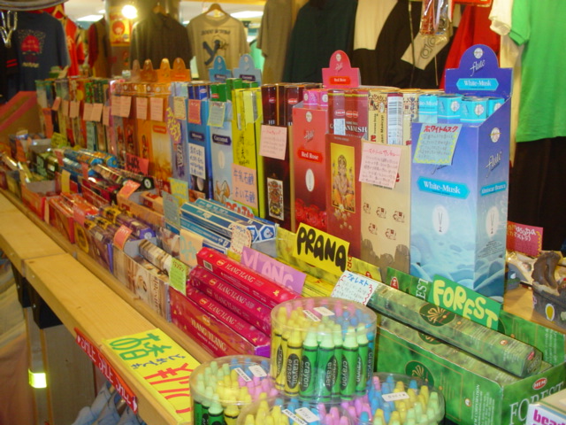 最近力を入れているのがお香(6角形の)です。これは富山で一番在庫量を誇っております(当店調べなので信用できるかどうかはあなた次第)。価格も色々調べ上げてほぼ一番安いといえる価格設定をしております。その他、ロック系のバッグ類や女の子向けアクセサリー、そして最近のキーアイテムとなっているスイマーといったところです。