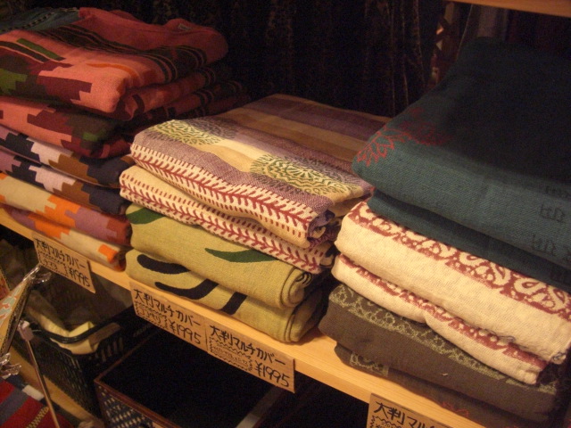 今回入荷のマルチカバーはアジアン系のものやチマヨ柄などの中南米っぽいいわゆるエスニック系のもので、素材は綿100%なので薄くてツルツルしたものではなく若干地厚でザラザラした質感です